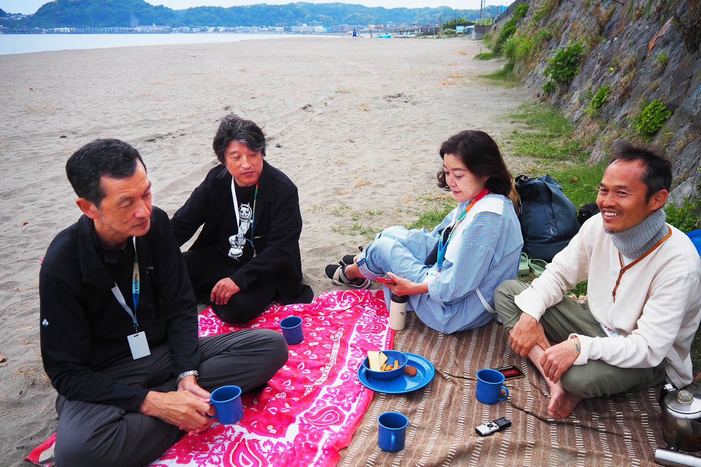 埼玉県から参加した男性は「海に来るのは久しぶりで、気持ちがいい」と満足した様子でした。日没前の海岸で、会話しながらのんびりと過ごす時間は格別です。お金をかけずに一緒の時間を過ごせる仲間を持つことも、日常を楽しむ秘訣(ひけつ)かもしれません。