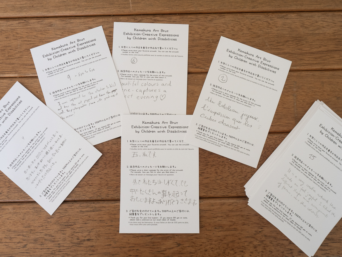写真を撮る人、アンケートを書く人、ベンチで休みがてら鑑賞する人など、楽しみ方もさまざま。シンガポールから観光に来ていた男性は「誰にでも強みはある。子どもたちに表現活動をさせるコンセプトが素晴らしいね」と展覧会の趣旨に共感した様子でした。